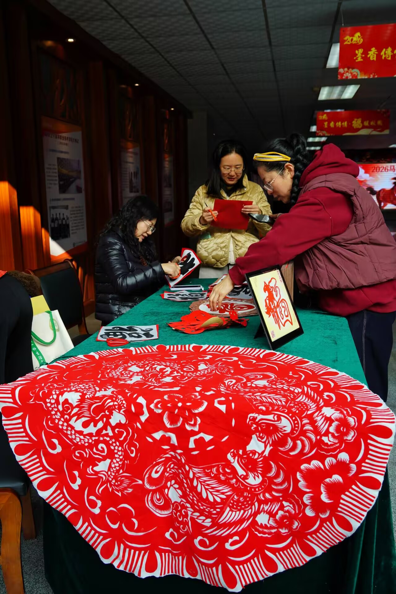 为让全体教职工沉浸式感受传统民俗的独特魅力,活动现场特别设置了毛笔书写体验区与非遗剪纸区,特邀专业老师现场手把手教学指导。从握笔运笔的章法技巧,到剪纸折剪的工艺诀窍,老师们耐心讲解、悉心示范,教职工们提笔蘸墨、巧手裁剪,在提笔落墨间感受书法笔墨之美,在指尖翻飞中领略非遗剪纸之韵,在沉浸式互动中体悟中华优秀传统文化的深厚底蕴与独特魅力。