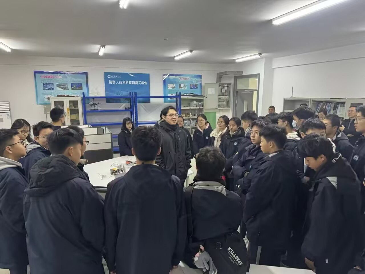 同学们分批参观了机械臂及机器人项目、PLC编程项目、自动化创新项目(无人机和氢气驱动单车)。刘博文同学作为江宁高职校2020级机电“3+4”项目毕业生,目前就读大三。他凭借扎实的技能在晓庄学院各项竞赛中屡获国家级大奖。在追忆母校美好而充实时光的同时,他也勉励学弟学妹们打好基础,为后续学习做好储备。“当时在进行无人机比赛的模块编程时,才发现模拟电路和数字电路学得不够深入;深入学习专业课时,又发现高等数学微积分掌握不足,于是我通宵达旦,奋力追赶。”因为拥有相似的经历,他的分享格外触动同学们的心弦。